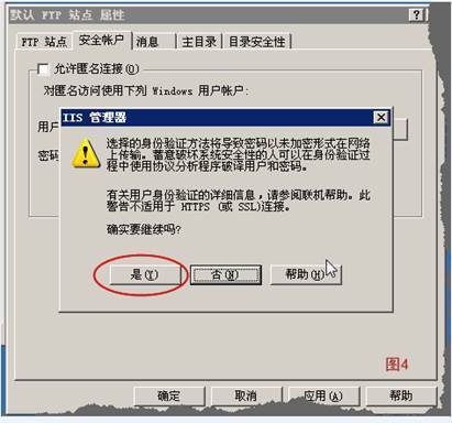 接下来展开找到我们已经建立好的ftp站点,右键“ftp站点”(我这里是默认ftp站点),选择 “属性”,切换到“安全账户”,这里会看到“允许匿名连接”是选中状态,我们把“允许匿名连接” 的复选框去掉,会弹出如图4的对话框,我们选择是。点击应用之后这样就不会存在匿名访问问题了。