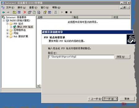 接下来创建ftp文件夹,在ftp的根目录下,创建一个跟我们账户一样的文件夹。接着,我们右键单击我们的ftp站点,选择新建->创建虚拟目录。在弹出来的对话框中选择下一步,这里我们需要输入ftp的别名(这里是ftp2),这里跟我们的创建的用户名需要一致(注意:别名和创建的文件夹和账户名需要一致。),点击下一步,这里选择我们新建立的文件夹的路径。这样我们就可以访问ftp了。