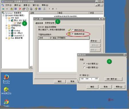 通过ip限制策略,我们限制用户登录ftp的ip地址。依次指向IIs管理器的FTP站点,右击并选择 “ftp属性”,打开“目录安全性”,在界面中选择“拒绝访问”,然后单击“添加”按钮定义允许访问的单一计算机、多台计算机,设置好的界面“目录安全性”是通过FTP用户的登录IP进行判断的一种机制.